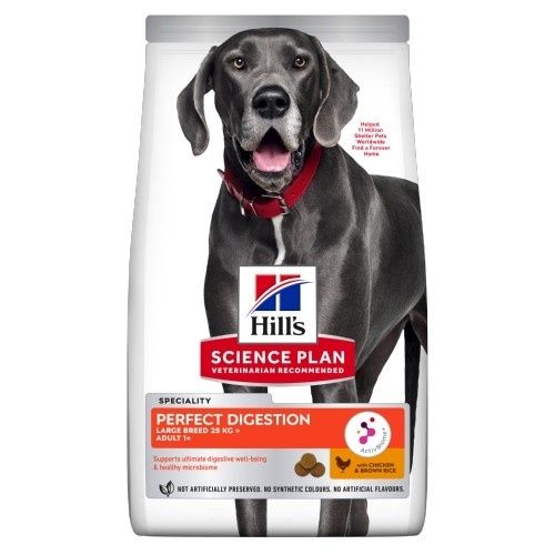 Hill's Science Plan Perfect Digestion Large avec poulet et riz complet pour chiens de grande race est un aliment complet et équilibré composé d'ingrédients sélectionnés qui favorisent le bien-être digestif. Il comprend la technologie ActivBiome+, développée pour aider à rétablir l'équilibre du microbiome grâce à un mélange unique de prébiotiques.